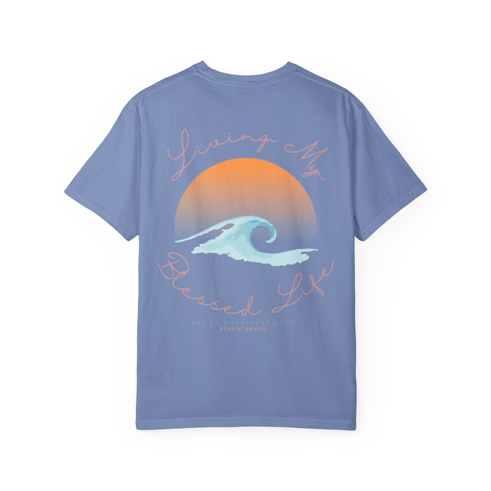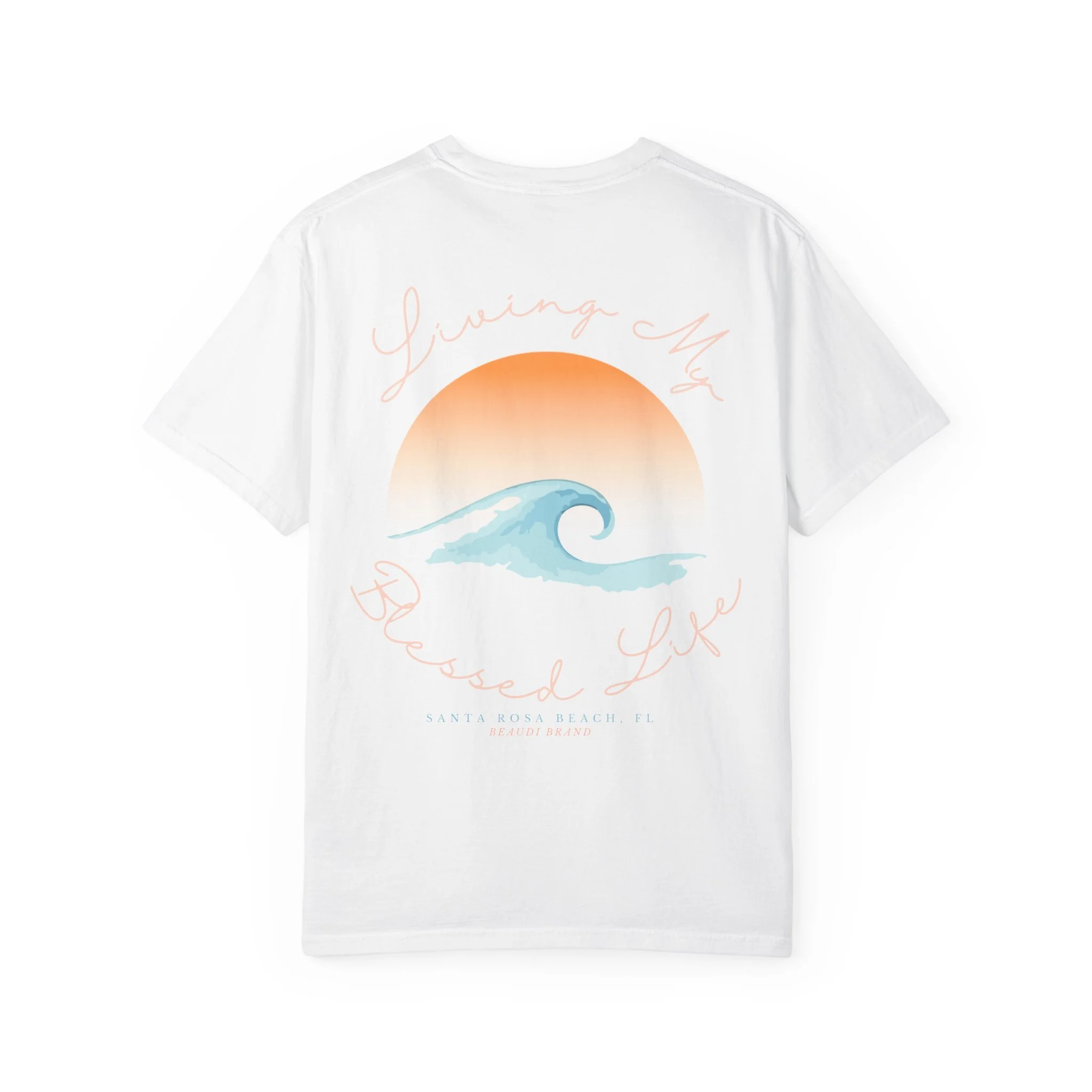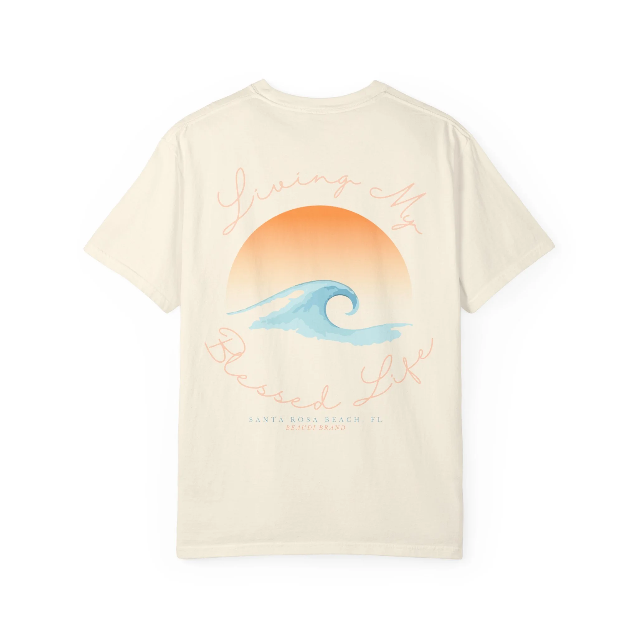 Light, lived-in, and quietly sun-soaked — this garment-dyed tee carries a coastal calm wherever you go. The relaxed silhouette and heavyweight, ring-spun cotton soften with wear, while the faded sunrise and watercolor wave on the back evoke slow mornings on the sand. Wear it after a dawn surf, on a road trip to the ocean, or while you sip coffee on the porch. The small, sandy-pink logo on the chest keeps the look understated and wearable every day. It’s for people who choose comfort without losing a sense of place — salty air, warm light, and soft fabric that remembers your shape.